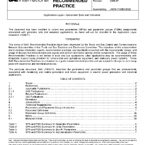 This particular document, SAE J1939-75, describes the parameters and parameter groups that are predominantly associated with monitoring and control generators and driven equipment in electric power generation and industrial applications. Parameters and parameter groups that may be associated with monitoring and control of the power units, such as engines, turbines, etc, that power the generators and driven industrial equipment and which may be applied in on- and off-highway applications, shall be documented in SAE J1939-71.