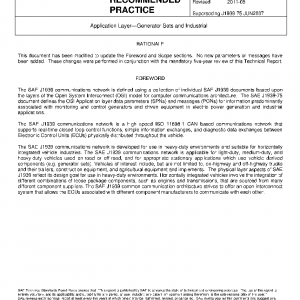 SAE J1939-75 Generator Sets and Industrial Applications defines the set of data parameters (SPNs) and messages (PGNs) for information predominantly associated with monitoring and control generators and driven equipment in electric power generation and industrial applications. Applications using the SAE J1939-75 document may need to reference SAE J1939-71 for the SAE J1939 parameters and messages for monitoring and controlling the power units, e.g. engines and turbines, that power the generators and driven industrial equipment.