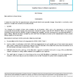 The following list consists of hose data provided as of December, 2021, and is for convenience in determining acceptability of nonmetallic flexible hose assemblies intended for usage under 46 CFR 56.60-25. Where the maximum allowable working pressure (MAWP) or type of fitting is not specified, use the manufacturer’s recommended MAWP or type of fitting. This list has been compiled by SAE staff from information provided by the manufacturers whose product listings appear in this document.