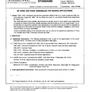 This SAE Standard covers specific requirements for several styles of hose and/or hose assemblies in systems on board commercial vessels inspected and certificated by the U.S. Coast Guard. It is intended that this document establish hose constructions and performance levels that are essential to safe operations in the marine environment. Refer to SAE J1273 for selection, installation, and maintenance of hose and hose assemblies.