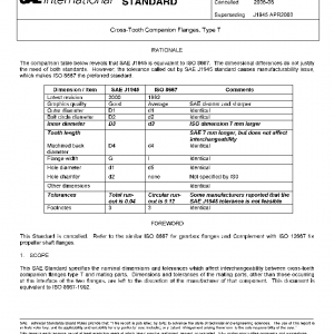 This SAE Standard specifies the nominal dimensions and tolerances which affect interchangeability between cross-tooth companion flanges type T and mating parts. Dimensions and tolerances of the mating parts, other than those occurring at the interface of the two flanges, are left to the discretion of the manufacturer of that component. This document is equivalent to ISO 8667-1992.