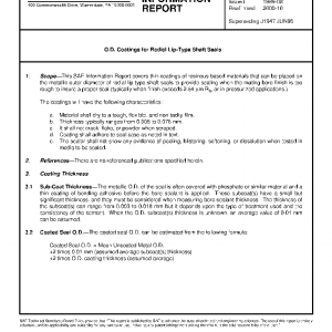 This SAE Information Report covers thin coatings of resinous based materials that can be placed on the metallic outer diameter of radial lip-type shaft seals to provide sealing when the mating bore finish is too rough to insure a proper seal (typically when finish exceeds 2.54 μm Ra, or in pressurized applications.)