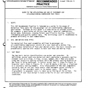 This SAE Recommended Practice is intended as a guide in the usage of mechanical face seals for the passenger car air-conditioning compressor application. Included in this guide is a compilation of present practices; for example, a description of various type seals, material combinations, design data, tolerances, drawing format, qualification testing, inspection information and quality control data. The terminology used is recommended to promote uniformity in seal nomenclature.