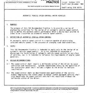 This SAE Recommended Practice is intended to apply only to the design of an automatic vehicle speed control. It is not intended to encourage or discourage the installation of automatic vehicle speed controls on any class of vehicles, nor is it intended to influence the requirements of engine speed governors.