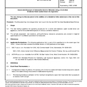 This test method specifies the operating procedures for a controlled irradiance, water cooled xenon arc apparatus used for the accelerated exposure of various automotive materials.