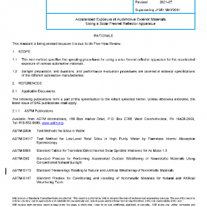 This test method specifies the operating procedures for using a solar fresnel reflector apparatus for the accelerated exposure of various automotive materials.