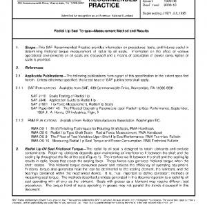 This SAE Recommended Practice provides information on procedures, tools, and fixtures useful in determining frictional torque measurement of radial lip oil seals. Information on the effect of various operational environments on oil seals are discussed and a means of calculation of power consumption of seals is provided.