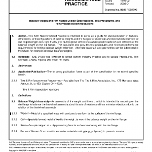 This SAE Recommended Practice is intended to serve as a guide for standardization of features, dimensions, and configurations of balance weights and rim flanges for aluminum and steel wheels intended for use on passenger cars, light trucks, and multipurpose vehicles to assure good installation and retention of the balance weight on the rim flange. This document also provides test procedures and minimum performance requirements for testing balance weight retention. Alternate materials and geometries can be addressed in the future, for example adhesive balance weights.
