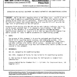 The purpose of this document is to provide equipment specifications for CFC-12 (R-12) recycling and/or recovery, and recharging systems. This information applies to equipment used to service automobiles, light trucks, and other vehicles with similar CFC-12 systems. Systems used on mobile vehicles for refrigerated cargo that have hermetically sealed systems are not covered in this document.
