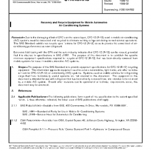 The purpose of this SAE Standard is to provide equipment specifications for CFC-12 (R-12) recycling equipment. This information applies to equipment used to service automobiles, light trucks, and other vehicles with similar CFC-12 (R-12) air-conditioning (A/C) systems. Systems used on mobile vehicles for refrigerating cargo that have hermetically sealed systems are not covered in this document. The equipment in this document is intended for use with refrigerant that has been directly removed from, and intended to be returned to, a mobile A/C system. Should other revisions due to operational or technical requirements occur, this document may be amended.