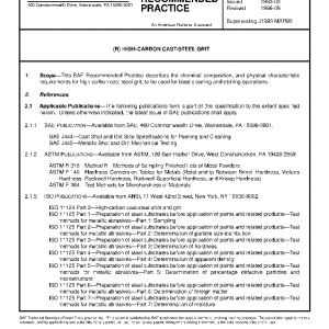 This SAE Recommended Practice describes the chemical composition, and physical characteristic requirements for high-carbon cast-steel grit, to be used for blast cleaning and etching operations.