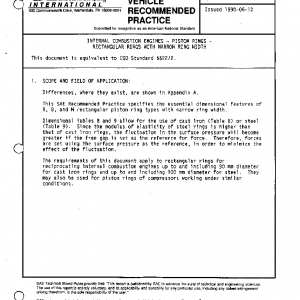 This SAE Recommended Practice specifies the essential dimensional features of R, B, and M rectangular piston ring types with narrow ring width.