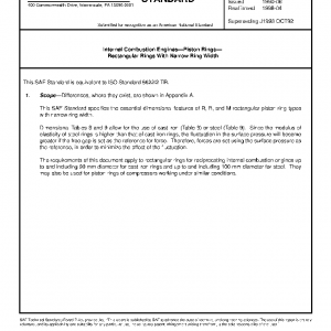 This SAE Standard specifies the essential dimensional features of R, B, and M rectangular piston ring types with narrow ring width.