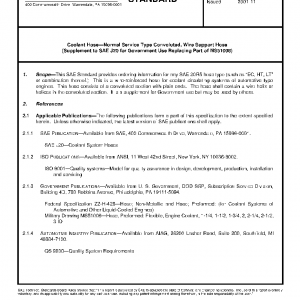 This SAE Standard provides ordering information for any SAE 20R5 hose type (such as “EC, HT, LT” or combination thereof.) This is a wire-reinforced hose for coolant circulating systems of automotive type engines. This hose consists of a convoluted section with plain ends. The hose shall contain a wire helix or helices in the convoluted section. It is a supplement for Government use but may be used by others.