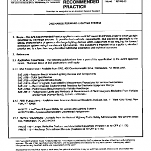 This SAE Recommended Practice applies to motor vehicle Forward Illumination Systems which use light generated by discharge sources. It provides test methods, requirements, and guidelines applicable to the special characteristics of gaseous discharge lighting devices which supplement those required for forward illumination systems using incandescent light sources. This document is intended to be a guide to standard practice and is subject to change to reflect additional experience and technical advances.