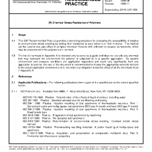 This SAE Recommended Practice provides a screening procedure for evaluating the susceptibility of plastics to environmental stress cracking by testing their resistance to pure solvents or their mixtures. This method can be used to evaluate effect of complex chemical mixtures with unknown or suspect components, which may be encountered in the polymer’s environment.