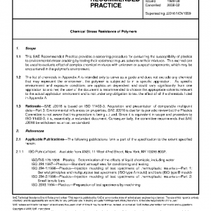 This SAE Recommended Practice provides a screening procedure for evaluating the susceptibility of plastics to environmental stress cracking by testing their resistance to pure solvents or their mixtures. This method can be used to evaluate effect of complex chemical mixtures with unknown or suspect components, which may be encountered in the polymer’s environment.