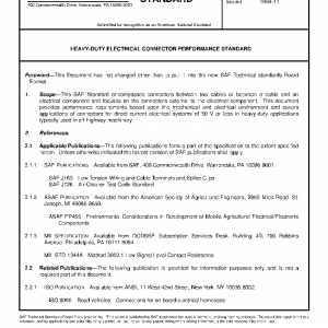 This SAE Standard encompasses connectors between two cables or between a cable and an electrical component and focuses on the connectors external to the electrical component. This document provides performance requirements based upon the mechanical and electrical environment and covers applications of connectors for direct current electrical systems of 50 V or less in heavy-duty applications typically used in off-highway machinery.