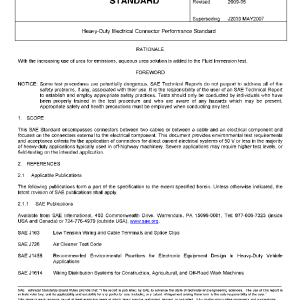 This SAE Standard encompasses connectors between two cables or between a cable and an electrical component and focuses on the connectors external to the electrical component. This document provides environmental test requirements and acceptance criteria for the application of connectors for direct current electrical systems of 50 V or less in the majority of heavy-duty applications typically used in off-highway machinery. Severe applications may require higher test levels, or field-testing on the intended application.