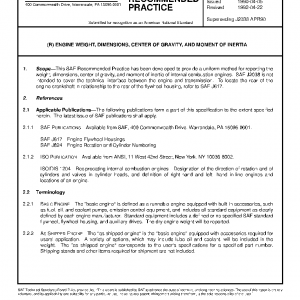 This SAE Recommended Practice has been developed to provide a uniform method for reporting the weight, dimensions, center of gravity, and moment of inertia of internal combustion engines. SAE J2038 is not intended to cover the technical interface between the engine and transmission. To locate the rear of the engine crankshaft in relationship to the rear of the flywheel housing, refer to SAE J617.