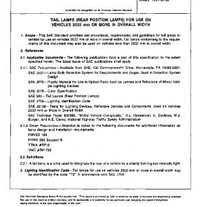 This SAE Standard provides test procedures, requirements, and guidelines for tail lamps intended for use on vehicles 2032 mm or more in overall width. Tail lamps conforming to the requirements of this document may also be used on vehicles less than 2032 mm in overall width.
