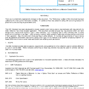 This SAE Standard provides test procedures, requirements, and guidelines for reflex reflectors used on vehicles 2032 mm or more in overall width. Reflex reflectors conforming to these requirements may also be used on vehicles less than 2032 mm in overall width.