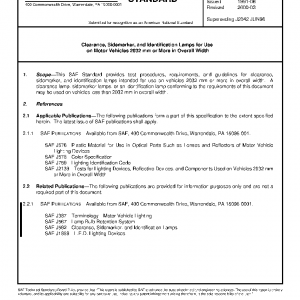 This SAE Standard provides test procedures, requirements, and guidelines for clearance, sidemarker, and identification lamps intended for use on vehicles 2032 mm or more in overall width. A clearance lamp, sidemarker lamps, or an identification lamp conforming to the requirements of this document may be used on vehicles less than 2032 mm in overall width.