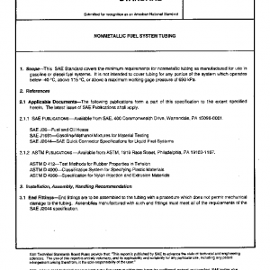 This SAE Standard covers the minimum requirements for nonmetallic tubing as manufactured for use in gasoline or diesel fuel systems. It is not intended to cover tubing for any portion of the system which operates below -40 °C, above 115 °C, or above a maximum working gage pressure of 690 kPa.