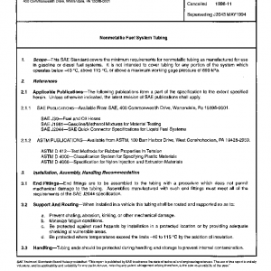 This SAE Standard covers the minimum requirements for nonmetallic tubing as manufactured for use in gasoline or diesel fuel systems. It is not intended to cover tubing for any portion of the system which operates below -40 degrees C, above 115 degrees C, or above a maximum working gage pressure of 690 kPa.