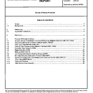 This SAE Information Report is a summary comparison of existing protocols found in manufacturing, automotive, aviation, military, and computer applications which provide background or may be applicable for Class C application. The intent of this report is to present a summary of each protocol, not an evaluation. This is not intended to be a comprehensive review of all applicable protocols. The form for evaluation of a protocol exists in this paper and new protocols can be submitted on this form to the committee for consideration in future revisions of this report. This report contains a table which provides a side-by-side comparison of each protocol considered. The subsequent section provides a more detailed examination of the protocol attributes. Many of the protocols do not specify a method for one or more of the criteria. In these circumstances ‘under defined’ or ‘not specified’ will appear under the heading. Certain protocol specifics or details are omitted for the sake of brevity. Every attempt is made to provide the interest reader with the necessary references for further research.