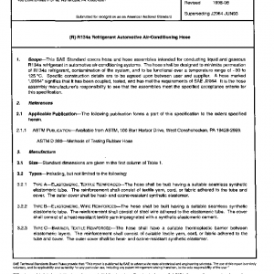 This SAE Standard covers hose and hose assemblies intended for conducting liquid and gaseous R134a refrigerant in automotive air-conditioning systems. The hose shall be designed to minimize permeation of R134a refrigerant, contamination of the system, and to be functional over a temperature range of −30 to 125 °C. Specific construction details are to be agreed upon between user and supplier. A hose marked “J2064” signifies that it has been coupled, tested, and has met the requirements of SAE J2064. It is the hose assembly manufacturer’s responsibility to see that the assemblies meet the specified acceptance criteria for this specification.