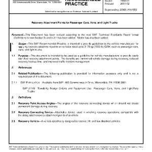 This SAE Recommended Practice is intended to provide guidelines to the vehicle manufacturer for applying recovery attachment points on vehicles rated up to 3178 kg (7000 lb) GVW, such as passenger cars, vans, and light trucks.