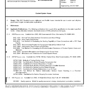 This SAE Standard covers reinforced and flexible hoses intended for use in water and ethylene glycol-based engine-coolant system applications.