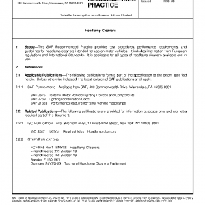 This SAE Recommended Practice provides test procedures, performance requirements, and guidelines for headlamp cleaners intended for use on motor vehicles. It includes information from European regulations and International Standards. It is applicable for all types of headlamp cleaners available and in use.