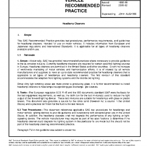 This SAE Recommended Practice provides test procedures, performance requirements, and guidelines for headlamp cleaners intended for use on motor vehicles. It includes information from European and Japanese regulations and International Standards. It is applicable for all types of headlamp cleaners available and in use.