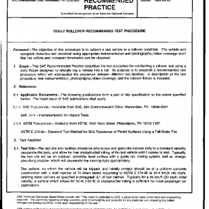 This SAE Recommended Practice describes the test procedure for conducting a rollover test using a dolly fixture designed to laterally trip a vehicle into a roll. Its purpose is to establish a recommended test procedure which will standardize the procedure between different test facilities. A description of the test procedure, test instrumentation, photographic/video coverage, and the rollover fixture is included.