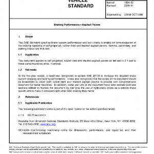 This SAE Standard specifies brake system performance and test criteria to enable uniform evaluation of the braking capability of self-propelled, rubber-tired and tracked asphalt pavers. Service, secondary, and parking brakes are included.