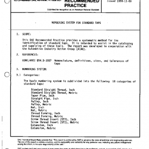 This SAE Recommended Practice provides a systematic method for the identification of standard taps. It is intended to assist in the cataloging and supplying of these tools. The report was developed in cooperation with the Automotive Industry Action Group (AIAG).