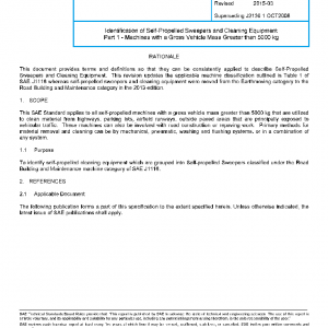 This SAE Standard applies to all self-propelled machines with a gross vehicle mass greater than 5000 kg that are utilized to clean material from highways, parking lots, airfield runways, outside paved areas that are principally exposed to vehicular traffic. These machines can also be involved with road construction or repaving work. Primary methods for material removal and cleaning can be by mechanical, pneumatic, washing and flushing systems, or in a combination of any system.
