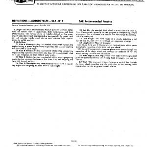 This SAE Recommended Practice provides uniform definitions for various types of motorcycles, their components, and basic characteristics. The various classes of vehicles defined in this report include only those which are intended at least partially for public road use and excludes vehicles which do not meet common legal requirements for public road use.