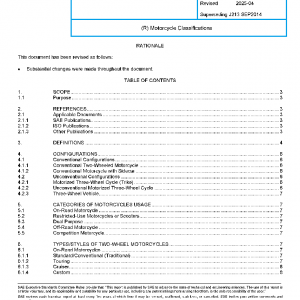 This SAE Recommended Practice provides uniform definitions and classifications for motorcycles and motorized three-wheel cycles.