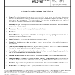 This SAE Recommended Practice provides for the continuous measurement of the hydrocarbon concentration in diesel exhaust.