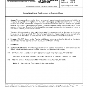 This test procedure is used to determine the steady-state directional control response of vehicles by measuring steady-state cornering behavior. Due to the wide range of operational conditions to which a vehicle can be subjected, the results of this testing do not provide a complete description of a vehicle’s total dynamic behavior; in particular, the procedure does not test the vehicle’s response during transient maneuvers. To fully assess a vehicle’s total dynamic behavior, it would be necessary to conduct other test procedures in order to evaluate the vehicle’s performance as a whole.