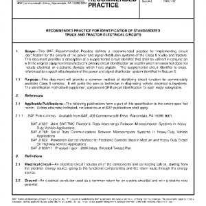 This SAE Recommended Practice defines a recommended practice for implementing circuit identification for the circuits of the power and signal distribution systems of the Class 8 trucks and tractors. This document provides a description of a supplemental circuit identifier that shall be utilized in conjunction with the original equipment manufacturer’s primary circuit identification as used in wire harnesses but does not include electrical or electronic devices which have pigtails. The supplemental circuit identifier is cross-referenced to a specified subsystem of the power and signal distribution system identified in Section 5.