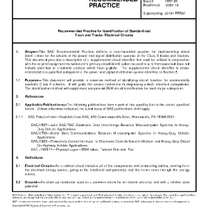 This SAE Recommended Practice defines a recommended practice for implementing circuit identification for the circuits of the power and signal distribution systems of the Class 8 trucks and tractors. This document provides a description of a supplemental circuit identifier that shall be utilized in conjunction with the original equipment manufacturer’s primary circuit identification as used in wire harnesses but does not include electrical or electronic devices which have pigtails. The supplemental circuit identifier is cross-referenced to a specified subsystem of the power and signal distribution system identified in Section 5.