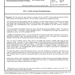 This SAE Standard defines the standard engine to be used in determining spark plug preignition ratings. The engine is known as the SAE 17.6 Cubic Inch Spark Plug Rating Engine.
