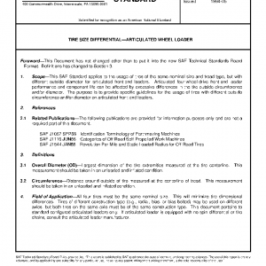 This SAE Standard applies to the usage of tires of the same nominal size and tread type, but with different outside diameter for articulated front-end loaders. Articulated four-wheel-drive front-end loader performance and component life can be affected by excessive differences in the tire outside circumference and/or diameter. The purpose is to provide specific guidelines for the usage of tires with different outside circumference and/or diameter on articulated front-end loaders.