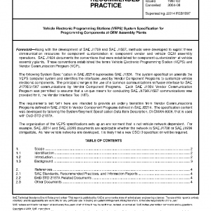 The SAE J2214 specification describes the application of the MS-DOS(TM) computer between the OEM and component vendors, defines the required elements comprising a Vehicle Electronics Programming Station, and identifies software interfaces needed between OEM-supplied elements and vendor-supplied elements. The software interfaces are described in SAE J2286 and SAE J1683. By maintaining common elements with J1924, the orderly transition from vendor Communication Programs to Vendor Component Programs will be assured. Beyond clarification of the J1924 document, the changes to VEPS and Vendor Communications Programs are focused on the implementation of a common method for communicating with the vehicle’s network for all vendor communications. The SAE J2214 specification describes the application of the MS-DOS(TM) computer between the OEM and component vendors, defines the required elements comprising a Vehicle Electronics Programming Station, and identifies software interfaces needed between O component vendors.