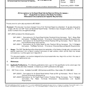 This SAE Standard specifies dimensional characteristics of flat blades of single-pole connectors and specific requirements for on-board electrical harnesses of road vehicles, which can be fitted into female connectors such as those given as in Appendix A.
