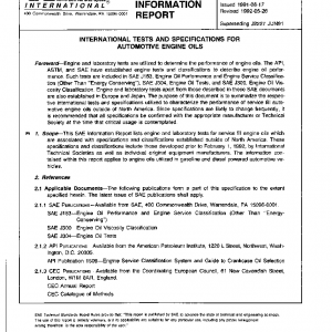 This SAE Information Report lists engine and laboratory tests for service fill engine oils which are associated with specifications and classifications established outside of North America. These specifications and classifications include those developed prior to February 1, 1992, by International Technical Societies as well as individual original equipment manufacturers. The information contained within this report applies to engine oils utilized in gasoline and diesel powered automotive vehicles.